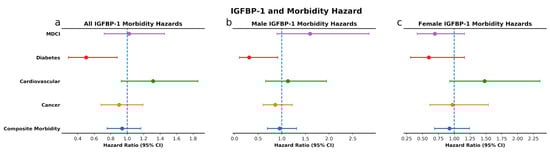 IGFBP-1 and morbidity hazard. Sex and age-adjusted morbidity hazards for all individuals (a), and age-adjusted morbidity hazard for males (b) and females (c) with high levels of IGFBP-1 as compared to individuals with low levels.