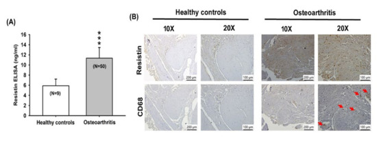 Resistin expression is increased among osteoarthritis (OA) patients. (A) Resistin serum levels in healthy controls (n = 9) and OA patients (n = 50) were quantified by the ELISA assay. (B) Immunohistochemistry (IHC) staining of resistin and CD68 (monocyte surface marker) for healthy controls (n = 10) and OA synovium (n = 10). *** p < 0.001 compared with healthy controls.