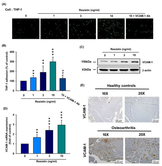 Monocyte adhesion to synovium tissue is an important phenomenon in OA pathogenesis [28]. However, nothing is known about the impact of resistin-enhanced VCAM expression and monocyte adhesion to synovium tissue in OA pathogenesis. In this study, resistin (0, 1, 3, and 10 ng/mL) enhanced monocyte (THP-1 cells) adhesion to OASFs in a concentration-dependent manner, and this phenomenon was effectively attenuated by VCAM-1 antibody (Figure 2A,B, Supplementary Figure S1A). Resistin (0, 1, 3, and 10 ng/mL) enhanced protein synthesis (Figure 2C) and VCAM-1 transcription (Figure 2D) in a concentration-dependent manner. VCAM-1 expression was significantly higher in the OA synovium compared with in normal synovium (Figure 2E). These findings indicate that resistin promotes VCAM-1 expression and monocyte adhesion in human OASFs.