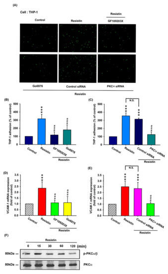 PKC signaling plays a key role in cellular functions that are triggered by various stimuli, including resistin [21,29]. To validate the role of PKC in resistin-enhanced VCAM-1 expression and monocyte adhesion, OASFs were pretreated with a PKC inhibitor (GF109203x), a specific PKCα/β inhibitor (Gö6976), and a PKCα siRNA before resistin administration. As shown in Figure 3A–C and Supplementary Figure S1b, the pretreatment of OASFs with GF109203x, Gö6976, or a PKCα siRNA before incubation with resistin significantly inhibited resistin-enhanced monocyte (THP-1) adhesion to OASFs. This phenomenon was effectively attenuated by GF109203x and Gö6976 administration (Figure 3D) or PKCα siRNA transfection (Figure 3E). Resistin stimulated PKCα/β phosphorylation in a concentration-dependent manner, as shown in the Western blot analysis (Figure 3F). These results demonstrate that resistin enhances VCAM-1 expression and monocyte adhesion by stimulating PKC phosphorylation.