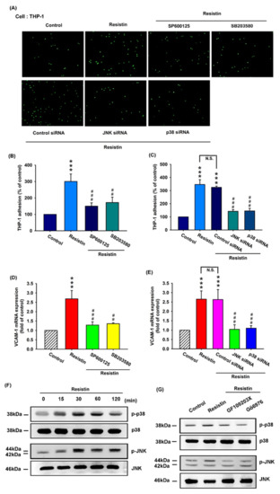 The p38 and JNK pathways are involved in resistin-enhanced VCAM-1 synthesis and monocyte adhesion. (A–E) OASFs were pretreated with inhibitors of JNK (SP600125) and p38 (SB203580) and their respective siRNAs, then incubated with resistin for 24 h. The adherence of THP-1 cells to cultured OASFs was photographed by fluorescence microscopy (A) and quantified (n = 4) (B,C). The transcription levels of VCAM-1 were quantified by the RT-qPCR assay (n = 4) (D,E). The extent of phosphorylation of p38 and JNK under resistin (10 ng/mL) stimulation (for 0, 15, 30, 60, or 120 min) was quantified by Western blotting (n = 3) (F). (G) OASFs were pretreated with a PKC inhibitor (GF109203x) or a specific PKCα/β inhibitor (Gö6976), then incubated with resistin for 24 h. The extent of p38 and JNK phosphorylation was quantified by Western blotting (n = 3). *** p < 0.001 compared with the control group; ## p < 0.01, and ### p < 0.001 compared with the resistin-treated group.