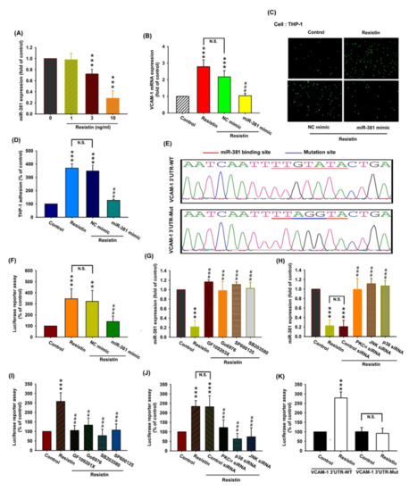 Various miRNAs display differential expression patterns between OA and normal knees and are involved in the pathogenesis of OA [13,31]. Using open-source software (TargetScan, miRMap, RNAhybrid, and miRWalk), we determined that miR-381 may interfere with VCAM-1 transcription. Resistin concentration-dependently inhibited miR-381 expression (Figure 5A). To determine whether resistin stimulates VCAM-1 expression and monocyte adhesion by inhibiting miR-381 synthesis, we transfected OASFs with miR-381 mimic and observed reductions in resistin-enhanced VCAM-1 transcription (Figure 5B) and monocyte adhesion (Figure 5C,D, Supplementary Figure S1d). We also constructed a luciferase reporter vector with the wild-type 3′-UTR of the VCAM-1 mRNA (wt-VCAM-1-3’-UTR) and a mutated vector harboring mismatches in the predicted miR-381 binding site (mut-VCAM-1-3’-UTR), to determine whether miR-381 interferes with the transcription of the VCAM-1 gene (Figure 5E). Resistin enhanced the luciferase activity of the wt-VCAM-1-3’-UTR plasmid but not that of the mut-VCAM-1-3’-UTR plasmid (Figure 5K). The miR-381 mimic reversed resistin-enhanced luciferase activity in the wt-VCAM-1-3’-UTR plasmid (Figure 5F), indicating that miR-381 directly suppresses VCAM-1 transcription by binding to the 3’-UTR region of the human VCAM-1 mRNA. In addition, the PKC, JNK, and p38 inhibitors (Figure 5G) and their respective siRNAs (Figure 5H) markedly reversed resistin-suppressed miR-381 transcription. Resistin-enhanced luciferase activity in the wt-VCAM-1-3’-UTR plasmid was reversed by the PKC, JNK, and p38 inhibitors (Figure 5I) and their respective siRNAs (Figure 5J). These results suggest that resistin inhibits miR-381 expression via the PKC, p38, and JNK signaling pathways.