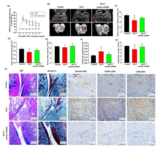 Resistin shRNA ameliorates the histologic severity of OA. (A) Between-group differences for changes in weight bearing in each hind paw for the control knee, anterior cruciate transection (ACLT) knee, and resistin shRNA-transfected ACLT knee (n = 8). (B) Micro-CT images of the control knee, ACLT knee, and resistin shRNA-transfected ACLT knee (n = 3). (C–G) The micro-CT parameters, including the subchondral bone volume (C), subchondral bone mineral density (D), bone surface density (E), trabecular separation (F), and trabecular number (G) of the control knee, ACLT knee, and resistin shRNA-transfected ACLT knee (n = 6). (H) Specimens from the control knee, ACLT knee, and resistin-shRNA-transfected ACLT knee were immunostained with Safranin-O, resistin, VCAM-1, and CD68 (monocyte surface marker) (n = 6). * p < 0.05, and ** p < 0.01 compared with control knees; # p < 0.05 compared with the ACLT group.