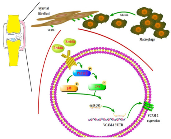 Schematic diagram summarizing the mechanism whereby resistin upregulates VCAM-1 expression in human synovial fibroblasts. Resistin induces VCAM-1 expression and monocyte adhesion through the PKC, p38, and JNK signaling cascades, and reduces miR-381 expression in OASFs.