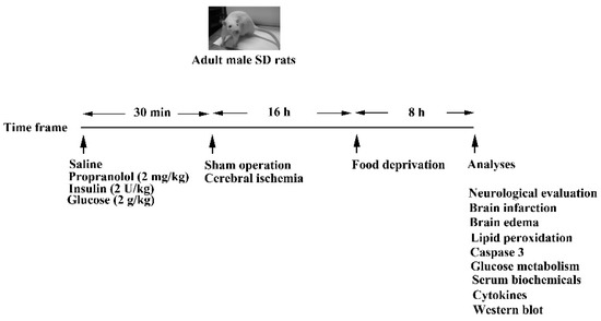 The protocols surrounding animal study were reviewed and approved by the Animal Experimental Committee of Taichung Veterans General Hospital and strictly adhered to as per the Institute’s guidelines (La-1071584, 1 August 2018). Adult male Sprague-Dawley rats weighing 300–350 g (n = 108 in total, with the specific numbers of rats indicated at the corresponding experiments) were anesthetized with isoflurane (2–4%), and body temperatures were maintained at 37.0 ± 0.5 °C. Focal cerebral ischemia was produced by clamping the two common carotid arteries and the right middle cerebral artery, as described previously [14]. For the sham operation, all surgical procedures were performed except for arterial occlusion. A single bolus of normal saline, propranolol (2 mg/kg), insulin (2 U/kg), or glucose (2 g/kg) was intraperitoneally delivered to ischemia or sham rats 30 min prior to surgery. All the ischemia and sham rats receiving treatments were euthanized for analyses 24 h after completion of surgery. A schematic diagram of the animal study is shown in Figure 1.