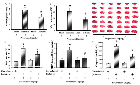 Propranolol protected against cerebral ischemia injury. Rats receiving a normal saline vehicle or a propranolol (2 mg/kg) intraperitoneal injection were subjected to sham or permanent cerebral ischemia for 24 h. (A) Neurological deficits were evaluated by neurological score. (B) Representative photographs show the histological examination of a brain infarction by triphenyltetrazolium chloride (TTC) staining. The average percentage of infarction volume in the ipsilateral hemisphere is depicted. (C) The water content in the contralateral and ipsilateral cortical tissues was measured. (D) The contents of malondialdehyde (MDA) in the contralateral and ipsilateral cortical tissues were measured. (E) Proteins were extracted from the contralateral and ipsilateral cortical tissues and subjected to an enzymatic assay of caspase 3 activity. * p < 0.05 vs. sham/saline or the contralateral tissues of the vehicle groups and # p < 0.05 vs. ischemia/saline or the ipsilateral tissues of the vehicle groups, n = 6.