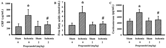 Propranolol alleviated postischemic changes in plasma biochemicals. Rats receiving a normal saline vehicle or a propranolol (2 mg/kg) intraperitoneal injection were subjected to sham or permanent cerebral ischemia for 24 h. The blood samples were collected and subjected to the measurement of C-reactive protein (CRP) (A), free fatty acids (B), and corticosterone (C). * p < 0.05 vs. sham/saline group and # p < 0.05 vs. ischemia/saline group, n = 6.