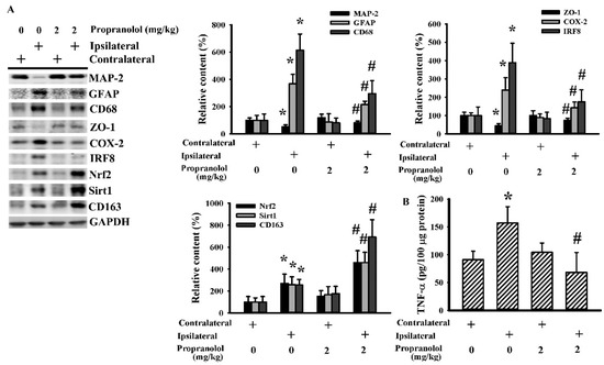 Propranolol alleviated postischemic brain inflammation. Rats receiving a normal saline vehicle or a propranolol (2 mg/kg) intraperitoneal injection were subjected to permanent cerebral ischemia for 24 h. Proteins were extracted from the contralateral and ipsilateral cortical tissues and subjected to Western blot (A) with the indicated antibodies or ELISA for the measurement of TNF-α (B). * p < 0.05 vs. the contralateral tissues of the vehicle group and # p < 0.05 vs. the ipsilateral tissues of the vehicle group, n = 6.