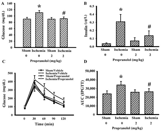 Propranolol alleviated postischemic hyperglycemia. Rats receiving a normal saline vehicle or a propranolol (2 mg/kg) intraperitoneal injection were subjected to sham and permanent cerebral ischemia for 24 h. The blood samples were collected from 8 h fasting rats and subjected to glucose (A) and insulin (B) measurement. The 8 h fasting rats were intraperitoneally injected with a glucose solution (2 g/kg). Blood samples were collected from the tail veins at the indicated times after treatments and the levels of glucose were measured (C). The area under the curve (AUC) of the glucose time curves was calculated (D). * p < 0.05 vs. sham/saline group and # p < 0.05 vs. ischemia/saline group, n = 6.