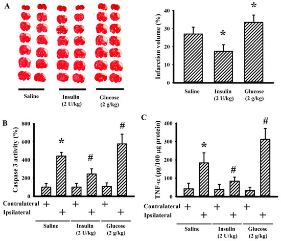 Insulin reduced but glucose augmented cerebral ischemia injury. Rats receiving a normal saline vehicle, insulin (2 U/kg), or a glucose (2 g/kg) intraperitoneal injection were subjected to permanent cerebral ischemia for 24 h. (A) Representative photographs show the histological examination of brain infarction by TTC staining. The average percentage of infarction volume in the ipsilateral hemisphere is depicted. (B) Proteins were extracted from the contralateral and ipsilateral cortical tissues and subjected to an enzymatic assay of caspase 3 activity. (C) Proteins were extracted from the contralateral and ipsilateral cortical tissues and subjected to ELISA for the measurement of TNF-α. * p < 0.05 vs. saline or the contralateral tissues of the vehicle group and # p < 0.05 vs. the ipsilateral tissues of the vehicle group, n = 6.