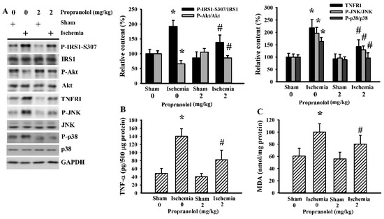 Skeletal muscles are the main peripheral organs/tissues for the uptake and utility of glucose, and once impaired, results in hyperglycemia and insulin resistance [31]. Upon examining the gastrocnemius muscles, cerebral ischemia caused a reduction in Akt phosphorylation and an increase in IRS1 phosphorylation at 307 serine residue, JNK phosphorylation, p38 phosphorylation, and TNFRI. Propranolol reversed the altered protein content and protein phosphorylation in cerebral ischemic rats (Figure 7A). There was an elevated level of TNF-α (Figure 7B) and MDA (Figure 7C) in the gastrocnemius muscles of cerebral ischemic rats. The altered parameters in the postischemic gastrocnemius muscles were alleviated by propranolol. In conclusion, the impaired insulin signaling in the gastrocnemius muscles represented an alternative mechanism for the induction of postischemic hyperglycemia and insulin resistance, with propranolol improving the impairment.