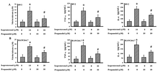 Propranolol alleviated cytokine production in BV2 and RAW264.7 cells. BV2 (A) and RAW264.7 (B) cells were pretreated with a vehicle or propranolol (10 μM) for 30 min before being incubated with isoproterenol (0 and 10 μM) for an additional 24 h. Supernatants were collected and subjected to a Griess reagent or ELISA for the measurement of nitric oxide (NO), TNF-α, and interleukin-6 (IL-6). * p < 0.05 vs. untreated control and # p < 0.05 vs. isoproterenol control, n = 4.