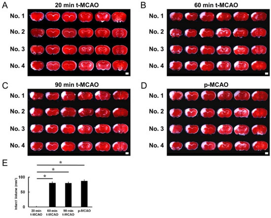 TTC staining at 1 d post stroke in four mice per condition (No. 1, 2, 3, 4). Following 20-min t-MCAO, partial ischemia was observed in 1/4 mice (No. 4) (A). In contrast, ischemia was observed in all mice after 60-min t-MCAO (B), 90-min t-MCAO (C), and p-MCAO (D). Compared to 20-min t-MCAO, infarct volume was significantly higher in mice after 60-min t-MCAO, 90-min t-MCAO, and p-MCAO, but not different between these groups (E). Scale bars = 2 mm (A–D). * p < 0.05 vs. 20 min t-MCAO (E) (n = 4, for each group). Abbreviations: p-MCAO, permanent middle artery occlusion; t-MCAO, transient middle cerebral artery occlusion.
