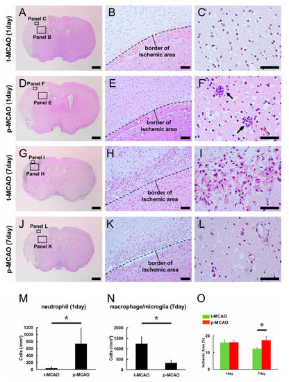 H&E staining of brain sections obtained following 90-min t-MCAO (A–C and G–I) and p-MCAO (D–F and J–L) at 1 d (A–F) and 7 d (G–L) post stroke. Ischemic changes indicating cell death characterized by nuclear pyknotic changes were observed within the ischemic areas (B,E,H,K). At 1 d post stroke, neutrophils were observed within ischemic areas after p-MCAO (F, arrows,M), and to a lesser extent after t-MCAO (C,M). At 7 d post stroke, more macrophages/microglia were observed within the ischemic areas after 90-min t-MCAO (I,N) compared to p-MCAO (L,N). The size of the ischemic areas was not significantly different between the groups at 1 d post stroke, but was significantly smaller 7 d after 90-min t-MCAO compared to p-MCAO (O). Results are representative of three replicates. Scale bars = 1 mm (A,D,G,J), 100 μm (B,E,H,K), and 50 μm (C,F,I,L). * p < 0.05 between stroke models (90-min t-MCAO vs. p-MCAO), within day (M–O) (n = 3, for each model). Abbreviations: H&E, hematoxylin and eosin; p-MCAO, permanent middle artery occlusion; t-MCAO, transient middle cerebral artery occlusion.