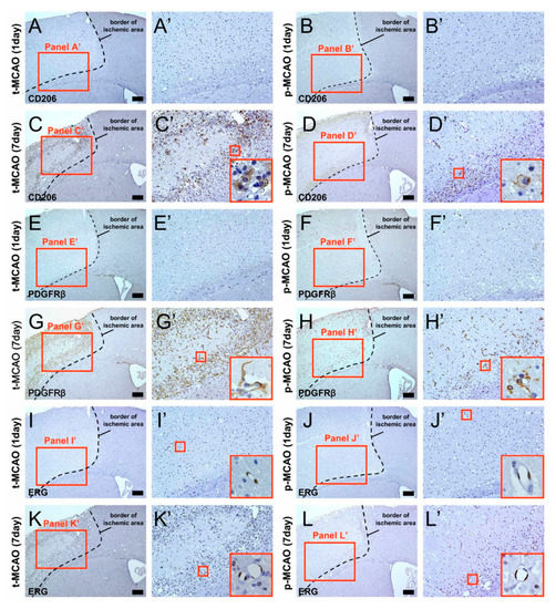Immunohistochemistry for CD206, PDGFRβ, and ERG at 1 d and 7 d after 90-min t-MCAO or p-MCAO. CD206 (A,A’,B,B’) and PDGFRβ (E,E’,F,F’) were minimally expressed 1 d after 90-min t-MCAO (A,A’,E,E’) and p-MCAO (B,B’,F,F’). However, at 7 d post stroke, many CD206+ (C,C’,D,D’) and PDGFRβ+ cells (G,G’,H,H’) were observed within the ischemic areas after 90-min t-MCAO (C,C’,G,G’) and p-MCAO (D,D’,H,H’). Quantitative analysis at 7 d post stroke showed that CD206+ (M) and PDGFRβ+ areas (N) were significantly larger in mice after 90-min t-MCAO compared to p-MCAO. ERG+ endothelial cells were observed within the ischemic areas 1 d (I,I’,J,J’) and 7 d (K,K’,L,L’) after 90-min t-MCAO (I,I’,K,K’) and p-MCAO (J,J’,L,L’). However, quantitative analysis at 1 d (O) and 7 d (P) post stroke showed that the number of ERG+ vessels was significantly higher within the ischemic and peri-ischemic areas after 90-min t-MCAO compared to p-MCAO. Results are representative of three replicates. Scale bars = 200 µm (A–L). * p < 0.05 between stroke models (90-min t-MCAO vs. p-MCAO) (M–P) (n = 3, for each model). Abbreviations: CD206, cluster of differentiation 206; ERG, ETS-related gene; PDGFRβ, platelet derived growth factor receptor-beta; p-MCAO, permanent middle artery occlusion; t-MCAO, transient middle cerebral artery occlusion.