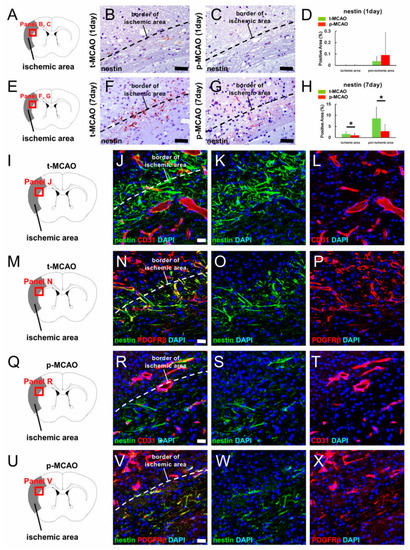 Immunohistochemistry for nestin at 1 d (A–C) and 7 d (E–G) after 90-min t-MCAO (B,F) or p-MCAO (C,G). At 1 d post stroke, nestin+ areas were not significantly different between the stroke models within the ischemic and peri-ischemic areas (D), but were significantly larger in both regions 7 d after 90-min t-MCAO compared to p-MCAO (H). Immunohistochemistry at 7 d after 90-min t-MCAO (I–P) or p-MCAO (Q–X) showed that some nestin+ cells within ischemic and peri-ischemic areas localized near CD31+ endothelial cells [90-min t-MCAO, nestin (J and K: green), CD31 (J and L: red), DAPI (J–L: blue); p-MCAO, nestin (R and S: green), CD31 (R and T: red), DAPI (R–T: blue)] and co-expressed PDGFRβ [90-min t-MCAO, nestin (N and O: green), PDGFRβ (N and P: red), DAPI (N–P: blue); p-MCAO, nestin (V and W: green), PDGFRβ (V and X: red), DAPI (V–X: blue)]. Results are representative of three replicates. Scale bars = 50 µm (B,C,F,G) and 20 µm (J,N,R,V). * p < 0.05 between stroke models (90-min t-MCAO vs. p-MCAO) (H) (n = 3, for each model). Abbreviations: DAPI, 4′,6-diamidino-2-phenylindole; PDGFRβ, platelet derived growth factor receptor-beta; p-MCAO, permanent middle artery occlusion; t-MCAO, transient middle cerebral artery occlusion.