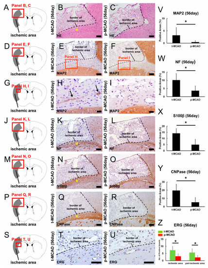H&E staining (A–C) obtained 56 d after 90-min t-MCAO (B) and p-MCAO (C). The tissues around the ischemic area border were thicker after 90-min t-MCAO compared to p-MCAO (B, asterisk). Immunohistochemistry for MAP2 (D–I), neurofilament (J–L), S100β (M–O), and CNPase (P–R) at 56 d post stroke revealed that these neural markers were more prominent after 90-min t-MCAO (MAP2+ neurons (E,H, arrows), NF+ neurons (K, asterisk), S100β+ astrocytes (N, asterisk), CNPase+ oligodendrocytes (Q, asterisk)) compared to p-MCAO (MAP2+ neurons (F,I), NF+ neurons (L), S100β+ astrocytes (O), CNPase+ oligodendrocytes (R)). Immunohistochemistry at 56 d post stroke showed that more ERG+ endothelial cells (S–U) were observed after 90-min t-MCAO (T) compared to p-MCAO (U). Quantitative analysis showed that peri-ischemic areas positive for MAP2 (V), neurofilament (W), S100β (X), and CNPase (Y) markers were significantly larger after 90-min t-MCAO compared to p-MCAO. Quantitative analysis showed that the number of ERG+ vessels within and peri-ischemic areas was significantly greater after 90-min t-MCAO compared to p-MCAO (Z). Results are representative of three replicates. Scale bars = 100 μm (B,C,E,F,K,L,N,O,Q,R), 20 μm (H,I), and 50 μm (T,U). * p < 0.05 between stroke models (90-min t-MCAO vs. p-MCAO) (V–Z) (n = 3, for each model). Abbreviations: CNPase, 2’,3’-Cyclic-nucleotide 3’-phosphodiesterase; ERG, ETS-related gene; GFAP, glial fibrillary acidic protein; H&E, hematoxylin and eosin; MAP2, microtubule-associated protein 2; NF, neurofilament; p-MCAO, permanent middle artery occlusion; t-MCAO, transient middle cerebral artery occlusion.