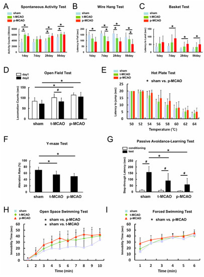 The spontaneous activity (A), wire hang (B), and basket (C) tests were performed 1, 7, 28, and 56 d post stroke. The open-field (D), hot plate (E), Y-maze (F), passive avoidance learning (G), open space swimming (H), and forced swimming (I) tests were performed 56 d post stroke. * p < 0.05 between groups (sham-operation vs 90-min t-MCAO, sham-operation vs. p-MCAO, or 90-min t-MCAO vs. p-MCAO), within day (A–I). # p < 0.05 between days 1 and 2 (D). # p < 0.05 between conditioning and test days (G). (n = 12 for sham, n = 16 for t-MCAO, n = 11 for p-MCAO). Abbreviations: p-MCAO, permanent middle artery occlusion; t-MCAO, transient middle cerebral artery occlusion.