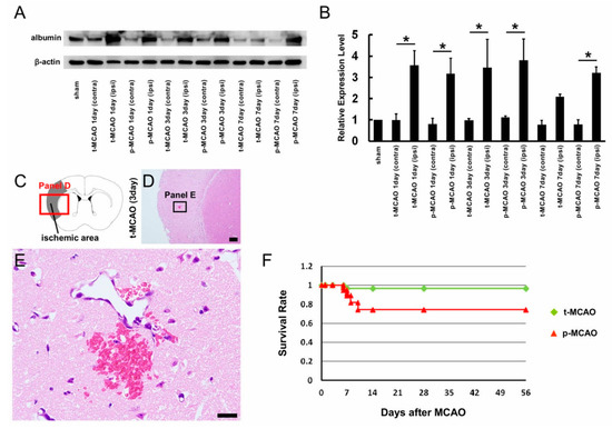 Western blot analysis of albumin expression in brain samples obtained from ipsilateral ischemic or contralateral non ischemic MCA areas after 90-min t-MCAO and p-MCAO (A,B). At 1 and 3 d post stroke, albumin expression levels in the ipsilateral ischemic MCA areas were significantly greater than in the contralateral non-ischemic MCA areas after 90-min t-MCAO and p-MCAO (B). At 7 d post stroke, albumin expression levels in the ipsilateral ischemic MCA areas were significantly greater than in the contralateral non-ischemic MCA areas after p-MCAO, but not 90-min t-MCAO (B). H&E staining was performed for mice after 90-min t-MCAO and p-MCAO. H&E staining indicated hemorrhagic transformation after 90-min t-MCAO at 3 d post stroke. (n = 18, for each model) (C–E). A Kaplan–Meier curve showed that survival rates were not significantly different between the stroke models (n = 49 for t-MCAO, n = 56 for p-MCAO) (F). * p < 0.05 between brain regions (B) (n = 3, for each sample). Scale bars = 200 µm (D) and 20 µm (E). Abbreviations: contra, contralateral; H&E, hematoxylin and eosin; ipsi, ipsilateral; p-MCAO, permanent middle artery occlusion; t-MCAO, transient middle cerebral artery occlusion; MCA, middle cerebral artery.