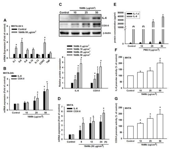 Concentration- and time-dependent increase in IL-6 production by particulate matter (PMs). (A) Human rheumatoid arthritis fibroblast-like synoviocytes (RA-FLS) were incubated with PMs (50 μg/cm2) for 24 h. The mRNA expression of inflammatory cytokines were examined using qPCR (n = 4); (B) RA-FLS were incubated with various concentrations of PMs for 24 h. The mRNA expression of IL-6 and COX-2 were examined using qPCR (n = 4); (C) RA-FLS were incubated with various concentrations of PMs for 24 h. The protein expression of IL-6 and COX-2 were examined using western blot (n = 4); (D) RA-FLS were incubated with PMs (50 μg/cm2) for 6, 12 or 24 h. The mRNA expression of IL-6 and COX-2 were examined using qPCR (n = 4); (E) RA-FLS were incubated with various concentrations of PMs for 24 h; supernatants and cell lysates were then collected. The IL-6 level in the culture media was measured using a Quantikine ELISA kit (n = 4); (F,G) RA-FLS were incubated with various concentrations of PMs for 24 h. IL-6 and COX-2 luciferase activity was measured and the results were normalized to the β-galactosidase activity. Results are expressed as mean ± SD. * p < 0.05 compared with the control; # p < 0.05 compared with the PM-treated group.