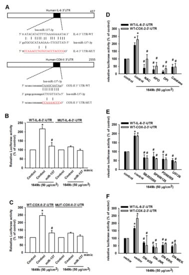 PMs increases IL-6 and COX-II-expression via inhibition of hsa-miR-137 through the MEK, ERK, p38 and JNK signaling pathways. (A) Schematic 3’-UTR representation of human IL-6 and COX-II containing the hsa-miR-137 binding site; (B,C) Cells were transfected with indicated luciferase plasmids before incubation with PM2.5 for 24 h; Luciferase activity was assessed; (D–F) Incubation with ROS, MEK, ERK, JNK and p38 inhibitors or MEK, ERK, JNK and p38 MAPK mutants reversed PM-mediated IL-6 and COX-II-3’-UTR luciferase activity. Results are expressed as the mean ± SD. * p < 0.05 as compared with baseline. # p < 0.05 as compared with the PM2.5-treated group.