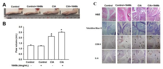Administration of PMs augments bone erosion and IL-6 and COX-II expression in a collagen-induced arthritis (CIA) model. (A,B) Hind paw swelling was photographed and measured with a digital plethysmometer in healthy controls, untreated CIA mice and in CIA mice administered PMs 4 mg/kg (C) Histologic sections of ankle joints were stained with H&E and Toluidine blue O or immunostained with COX-II and IL-6 antibodies. Results are expressed as the mean ± SD. * p < 0.05 compared with controls; # p < 0.05 compared with the PMs-treated group.
