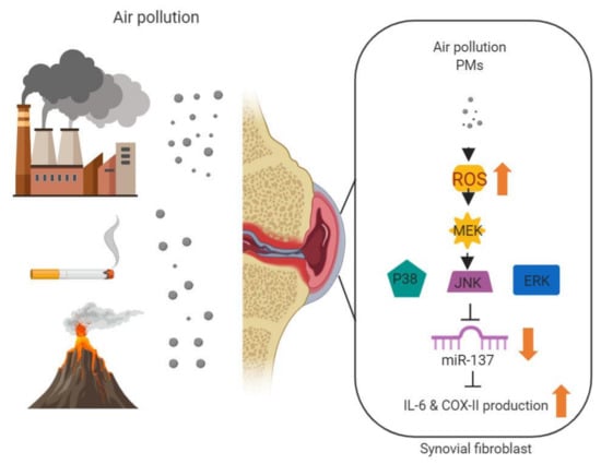 We have shown that exposure to PMs results in hsa-miR-137 downregulation and an increase of IL-6 and COX-II production in RA-FLS, causing inflammation and RA exacerbation. The molecular mechanisms include ROS-mediated MAPK signaling pathways that cause increased IL-6 and COX-II through downregulation of hsa-miR-137 (Figure 7). A better understanding of the regulatory pathways helps to develop therapeutic strategies and potential targeting. In the future, further research is needed to investigate whether targeting hsa-miR-137 or inhibitors of ROS/MAPK signaling pathways can suppress the PMs-induced RA exacerbation.
