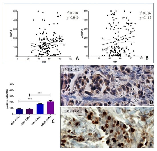In order to investigate the different role of nBMP-2 and BMP-2 in breast cancer progression, the expression of these molecules has been compared to age and evaluated in benign and malignant lesions. Concerning the linear regression analysis, a significant association was observed between the number of BMP-2-positive cells and the patients’ age, regardless of the lesion type (r2 0.258; p = 0.049) (Figure 1A). Conversely, no significant association was found considering the nBMP-2-positive cells (r2 0.016; p = 0.117) (Figure 1B).
