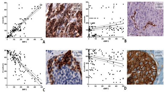 Linear regression analyses were performed to evaluate the possible association among BMP-2 and nBMP-2 and the main markers of EMT, such as vimentin and e-cadherin (Figure 2A–D).