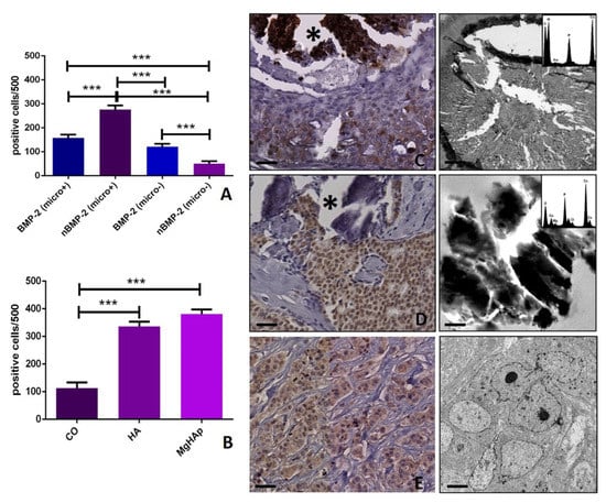 The capability of nBMP-2 expression to predict the type/elemental composition of microcalcifications was investigated by correlating the number of positive nBMP-2 and the presence of calcium oxalate (CO), hydroxyapatite (HA) and magnesium-substitute hydroxyapatite (Mg–HAp) (Figure 3B–E). The elemental composition of breast microcalcifications was previously investigated on a paraffin serial section by using the TEM and EDX apparatus. A significant increase in the number of nBMP-2-positive cells was found in both HA (335.9 ± 17.19) and Mg–HAp (381.5 ± 15.77) groups if compared with lesions characterized by the presence of CO (112.7 ± 20.4) (CO vs. HA p < 0.0001; CO vs. Mg–HAp p < 0.0001; HA vs. Mg–HAp p = 0.0966). Also, a significant group effect was found (p < 0.0001) (Figure 3B).