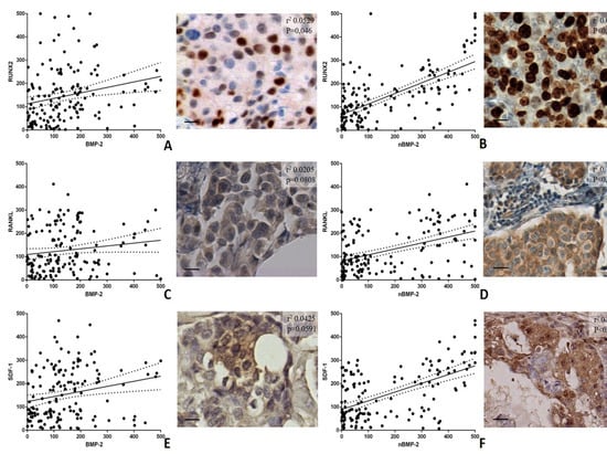 Linear regression analysis of the association among cytoplasmic BMP-2, nBMP-2, and bone biomarkers RUNX2, RANKL and SDF-1. (A) The graph displays significant association between the number of BMP-2-positive cells and RUNX2. The image shows some RUNX2-positive breast cancer cells in an infiltrating breast carcinoma. (B) The graph shows a significant association between the number of nBMP-2-positive cells and RUNX2. The image displays numerous RUNX2-positive breast cancer cells in an infiltrating breast carcinoma. (C) The graph displays no association between the number of BMP-2-positive cells and RANKL. The image shows some RANKL-positive breast cancer cells in an infiltrating breast carcinoma. (D) The graph displays significant association between the number of nBMP-2-positive cells and RANKL. The image displays several RANKL-positive breast cancer cells in an infiltrating breast carcinoma. (E) The graph displays no association between the number of BMP-2-positive cells and SDF-1. The image shows rare SDF-1-positive breast cancer cells in an infiltrating breast carcinoma. (F) The graph shows significant association between the number of nBMP-2-positive cells and SDF-1. The image shows some SDF-1-positive breast cancer cells in an infiltrating breast carcinoma. The scale bar represents 200 µm for each image.