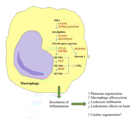 - Dalli, J.; Vlasakov, I.; Riley, I.R.; Rodriguez, A.R.; Spur, B.W.; Petasis, N.A.; Chiang, N.; Serhan, C.N. Maresin conjugates in tissue regeneration Biosynthesis enzymes in human macrophages. Proc. Natl. Acad. Sci. USA 2016, 113, 12232–12237. [Google Scholar] [CrossRef]