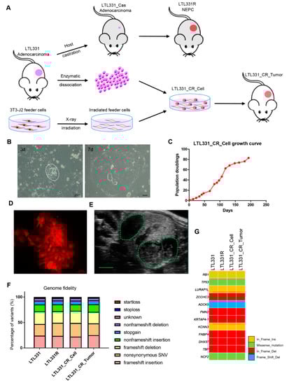We applied the CR culture method to establish LTL331 primary cells with the hope of providing an ex vivo interface to study NEPC development. In brief, freshly collected LTL331 tumor was enzymatically disassociated. The cells were then plated onto irradiated 3T3-J2 feeder cells and cultured using CR culture F medium (Figure 1A). The established primary cell line is designated LTL331_CR_Cell hereafter. LTL331_CR_Cells were re-grafted under the renal capsules of male mice to determine in vivo tumor growth and their corresponding histopathological characteristics (i.e., overall tumor structure, microscopic appearance of cancer cells, and cell-type marker expressions) (Figure 1A). In vitro, LTL331_CR_Cells formed colonies with epithelial morphology 3 days after initial plating and rapidly reached proliferative confluence in one week (Figure 1B). The average population doubling time was 72 h as estimated from 20 passages over 200 days (Figure 1C). This doubling time is three-fold shorter than that of the parental tumor (9 days) [10]. These CR cells were amenable to genetic manipulation as demonstrated by fluorescent protein labeling using lentiviral transduction (Figure 1D). We also re-grafted LTL331_CR_Cells (passage 10) under the renal capsules of male NOD/SCID mice (Figure 1E). This grafting site is where the parental LTL331 PDX tumor can survive and grow well. Tumors arising from LTL331_CR_Cells are designated LTL331_CR_Tumor hereafter. To confirm that LTL331_CR_Cell and LTL331_CR_Tumor conserve the genomic features of the parental LTL331 PDX, we analyzed the gene transcript mutation profiles using RNA-seq data. Both the whole transcript alteration landscape and the targeted gene mutation status show that LTL331_CR_Cell and LTL331_CR_Tumor share identical genomic alterations with parental LTL331 PDX (Figure 1F,G and Figure S1).