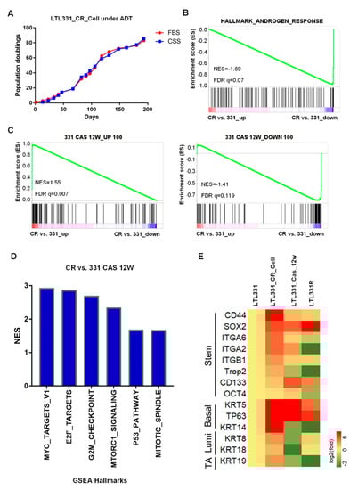 LTL331_CR_Cell is androgen independent with stem-like features. (A). Growth curve of LTL331_CR_Cells under androgen deprivation therapy (ADT) conditions. CR cells were cultured in medium containing charcoal stripped serum (CSS) to mimic ADT. The cells were passaged and cell numbers were recorded at each passage. The blue curve shows cells grown in CSS-containing medium, while the red curve shows cells grown in normal medium containing FBS. The red curve is the same as Figure 1C. (B) Inactivation of AR signaling in LTL331_CR_Cells. Transcriptomic analysis using gene set enrichment analysis (GSEA) shows that androgen response is downregulated in LTL331_CR_Cells compared to the parental LTL331. (C) The transcriptome of LTL331_CR_Cells partially resembles that of LTL331 post-castration. The top 100 upregulated and downregulated genes from 12-week post-castrated LTL331 were utilized as gene sets (i.e., 331 CAS 12W_UP 100, 331 CAS 12W_DOWN 100). GSEA comparing LTL331_CR_Cells to the parental LTL331 shows that a very similar set of castration-response genes are upregulated (left panel) and downregulated (right panel). (D) GSEA shows that select cancer hallmarks are enriched in LTL331_CR_Cells compared to post-castrated LTL331. The y-axis represents normalized enrichment scores (NES). The nominal p-values of all gene sets are less than 0.05. (E) Heatmap showing stem cell and cell lineage marker expression in LTL331_CR_Cells. Log-2 expression fold changes of select stem, basal, luminal, and intermediate transient amplifying (TA) cell markers were compared between LTL331_CR_Cell, 12-week post-castrated LTL331, LTL331R, and the parental LTL331.