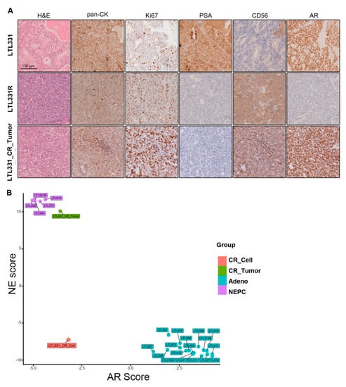Characterization of LTL331_CR_Tumor as NEPC. (A) Representative images showing IHC staining of LTL331, LTL331R, and LTL331_CR_Tumor. H&E, epithelial tumor marker pan-CK, proliferation marker Ki67, NE marker CD56, AR, and AR signaling marker PSA were stained as indicated in the images. Scale bar, 100 μm. (B) AR and NE scores of LTL331_CR_Tumor. NE and AR scores were calculated using transcriptomic data from LTL331_CR_Tumor. The scores were also calculated for other independent PDX models and LTL331_CR_Cell. Sample types are differentially colored based on their histopathological classifications.