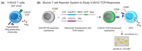 PAgs activate Vγ9Vδ2 T cells very rapidly as documented by the acidification of culture medium already nine seconds after the addition of the synthetic PAg BrHPP to a cell culture with a Vγ9Vδ2 T cell clone []. This finding has originally been taken as a hint for a direct binding of the PAg to the TCR, but attempts to demonstrate such an interaction have not been successful, despite the identification of positively charged hypothetical binding sites for PAg in the G115 Vγ9Vδ2 TCR crystal that resemble binding sites originally identified in phospholipids antibodies []. The idea of PAg directly binding to the TCR was in conflict with the increasing experimental evidence for a presentation of PAgs to the Vγ9Vδ2 T cell by cells of human or primate origin [], leading to a concept of non-polymorphic species-specific molecules acting as direct PAg-presenting molecules or being otherwise mandatory for PAg stimulation, e.g., by providing a γδ T cell-specific co-stimulus [,,]. Essentially, all cell types, including human γδ T cells and the widely used Jurkat T cell lymphoma, have the capacity of PAg presentation []. Furthermore, the activation of primary γδ T cells is massively modulated by activating and inhibiting cell surface receptors, leading to an interference that should be avoided [,,]. We hypothesized that rodents would lack PAg-presenting molecules and that rodent reporter cell lines would not be reactive to xenogeneic NK cell receptor ligands. Therefore, we generated reporter cells of murine origin (mouse 58C or mouse-rat T cell hybridoma 53/4) transduced with a Vγ9Vδ2 TCR of proven PAg reactivity to assess the presence of a putative PAg-presenting or Vγ9Vδ2 T cell-(co)stimulating molecule for cells of various tissue and species origin (Figure 2). Surprisingly, although interleukin (IL)-2 production by the TCR transductants could be triggered by anti-CD3 or anti-TCR monoclonal antibodies (mAbs), initial attempts to generate an IL-2 response to PAg in co-cultures with cells of human or primate origin failed []. However, this lack of response could be rescued by providing a co-stimulatory signal through the overexpression of a rat/mouse CD28 construct in the reporter cell and the use of CD80/CD86-expressing stimulatory cells; in some cases, this was achieved by CD80 transduction [,]. The generation of these reporter cell lines allowed to interrogate multiple cell types for their capacity to present PAgs. To reduce the chance of false-negative results, the same type of reporter cells was also tested for an αβ TCR response to a peptide antigen presented by APCs transduced with rat MHC class II molecules [,]. All types of cells of human or primate origin induced a PAg-dependent IL-2 production, but no response was observed with cells from mice, rats, hamster, dog, and cow (Kreiss, Li, Herrmann, Karunakaran, unpublished data).