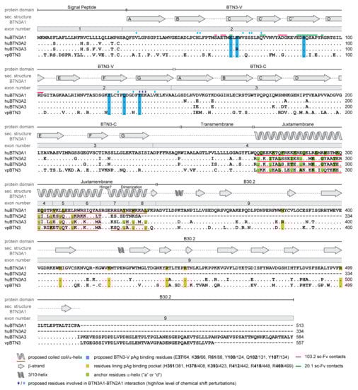 Sequence comparison of human and alpaca butyrophilin (BTN) 3 isoforms. Protein sequence alignment of human BTN3A isoforms and alpaca BTN3 (vpBTN3) (Clustal Omega and BioEdit). Identical amino acids (dots), gaps (dashes), and numbers (right side) are indicated. Amino acid numbers include the signal peptide and are written in standard letters. For amino acid numbers used in the main text, the leader peptide was left out. They are given in bold. The domains of BTN3 (protein domain) and corresponding exons (exon number) are shown according to human BTN3A1 [,,]. Some features of the secondary structure of BTN3A1 are visualized (according to [,] and the Protein Data Base BTN3A1 B30.2 protein structure 5HM7). Predicted coiled-coil structures in the juxtamembrane domain (JM) of all BTN3s are shown (red) together with predicted anchor residues (light green) as proposed by Wang et al. []. Proposed PAg-binding residues in the BTN3A1 V domain (BTN3-V) are highlighted in blue [] and residues lining the PAg binding pocket of B30.2 are shown in orange []. Contact regions of sc-Fv 103.2 (pink line) and 20.1 (dark green line) in the BTN3A1 V domain are indicated []. Blue arrows indicate the residues undergoing chemical shift perturbations (CSP) in a nuclear magnetic resonance (NMR) study of the BTN3A1–BTN2A1 interaction []. The residues with the most pronounced CSPs are marked with dark blue arrows, whereas lower CSPs are indicated by light blue arrows.