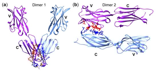 BTN3A ectodomain dimers. (a) Dimer 1: The BTN3A–EDs interact at their C domains to form a V-shaped dimer. Interacting residues are highlighted in red and blue. (b) Dimer 2: The V domain of a BTN3A–ED interacts with the C domain of another BTN3A–ED, forming a head-to-tail conformation. Interacting residues are highlighted in red (V domain) and blue (C domain). Contact residues of either domain [] are according to the PDB protein structures 4F9L and 4F80 and were modified with USCF Chimera1.1.