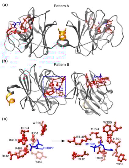 (E)-4-hydroxy-3-methyl-but-2-enyl pyrophosphate (HMBPP) binding to the BTN3A1 B30.2 domain. (a) Pattern A: Symmetric dimer formation by two B30.2 domains of BTN3A1 in HMBPP-bound form. HMBPP-B30.2 interfaces were positioned as far from each other as possible. (b) Pattern B: HMBPP-bound B30.2 domain forms asymmetric dimers where HMBPP and its interacting residues of a monomer are positioned at the interface of another monomer whose HMBPP interface is oriented to the opposite side. (c) Islet of pattern B representing HMBPP-interacting residues of the B30.2 monomer (left) and a changed orientation to obtain the most planar view (right). The JM is shown as an orange helix, positively charged residues surrounding the HMBPP pocket are shown in red, and HMBPP is shown in blue. For this figure, the PDB protein structure 5ZXK [] was modified with UCSF Chimera 1.1.