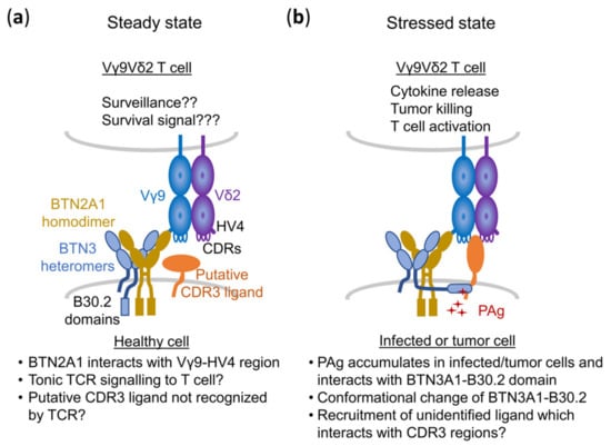 Composite ligand model of PAg sensing by the Vγ9Vδ2 TCR. (a) Steady state: A healthy APC would communicate with Vγ9Vδ2 T cells through an autonomous interaction between the BTN2A1 V domain and the Vγ9–HV4 region. This interaction might provide tonic signals necessary for the surveillance and survival of T cells without the involvement of the Vδ2 chain. Simultaneously, BTN3A tends to remain associated with BTN2A members on the APC via their V domains with unlikely interaction of BTN3A1 with the TCR (b) Action of PAg: In the presence of stress or PAgs, a PAg-dependent activation complex would be assembled on the APC. This complex could be inclusive of mandate BTN2A1 and BTN3A1 members, and other unidentified putative membrane proteins or ligands presumably recruited by BTN2/BTN3 members as a consequence of PAg interaction with the B30.2 domain of BTN3A1. Such an activation complex interacts with Vγ9Vδ2 TCR, which is certainly dependent on all CDRs of Vγ9 and Vδ2 chains (right). Picture modified after [].