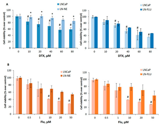 The cell lines LN-NE and LN-FLU are resistant to docetaxel and to 2-hydroxyflutamide. (A) LNCaP, LN-NE, and LN-FLU cells were incubated with increasing concentrations of docetaxel (DTX) for 24 h. Cell viabilities were determined by MTT assay and expressed as percentages of control (DMSO treatment). Experiments were run in quadruplicate and carried out at least two times on separate occasions. (B) LNCaP, LN-NE, and LN-FLU cells were incubated with increasing concentrations of 2-hydroxyflutamide (FLU) for 24 h. Cell viabilities were determined by MTT assay and expressed as percentages of control (DMSO treatment). Experiments were run in quadruplicate and carried out at least two times on separate occasions. *p < 0.01 significant difference between stem-like and parental cells and # p < 0.01 between treated and non-treated cells by two-way ANOVA and Tukey’s multiple comparisons test.