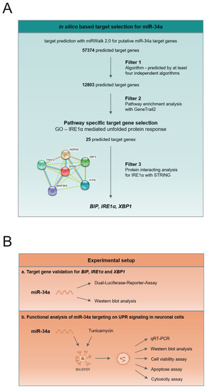 Paper workflow. (A) in-silico-based target selection for miR-34a, including protein interaction analysis by STRING. Putative miR-34a target genes were predicted by an in-silico-based approach and computationally filtered for IRE1α-mediated unfolded protein response resulting in the three target genes BIP, IRE1α and XBP1. STRING analysis: magenta lines: experimentally determined protein interactions; blue lines: known interactions from curated databases; yellow lines: text mining. (B) experimental setup. The target genes BIP, IRE1α and XBP1 for miR-34a-5p were experimentally validated, and the effect of miR-34a targeting was analyzed by functional analysis.