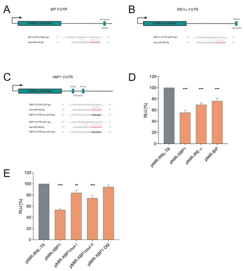 The BIP and IRE1α 3′UTRs harbored one binding site, respectively, whereas the gene XBP1 contained two binding sites within its 3′UTR (Figure 2A–C). To experimentally validate the predicted interactions between miR-34a-5p and the 3′UTR of the target genes, we cloned the 3′UTR sequences of the targets into pMIR-RNL-TK reporter plasmids, co-transfected these plasmids together with a miR-34a-5p expression plasmid in HEK293T cells, and measured the luciferase activity after 48 h. The dual luciferase assays showed a reduction in the relative luciferase activity (relative lights units, RLU) to 76% (p ≤ 0.001) for the BIP reporter plasmid pMIR-RNL-TK BIP 3′UTR, to 69% (p ≤ 0.001) for the IRE1α reporter plasmid pMIR-RNL-TK IRE1α 3′UTR, and to 56% (p ≤ 0.001) for the XBP1 reporter plasmid pMIR-RNL-TK XBP1 3′UTR (Figure 2D), each compared to control reporter plasmid pMIR-RNL-TK.