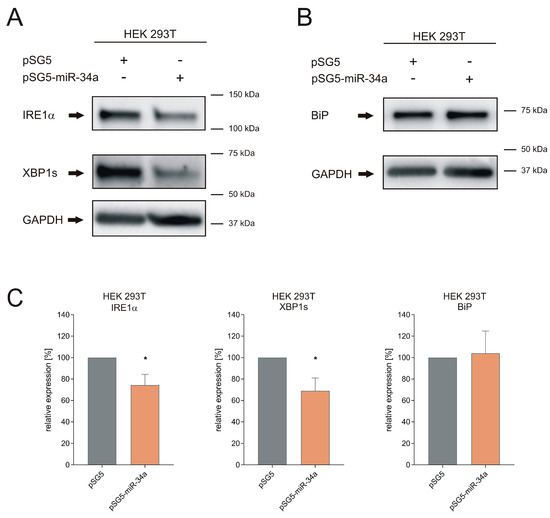 To further validate the results of the luciferase assays, we tested the impact of miR-34a-5p overexpression on the endogenous protein level of the miRNA target genes BIP, IRE1α, and XBP1s in HEK293T cells. After transfection of HEK293T cells with pSG5-miR-34a expression plasmid or pSG5 control plasmid, we determined changes in protein levels with specific antibodies in four independent experiments, each using GAPDH as an endogenous control. Figure 3A,B show one representative western blot for each target. Overexpression of miR-34a-5p led to a decrease to 74% (p ≤ 0.05) of the IRE1α protein levels and to 69% (p ≤ 0.05) of the levels of XBP1s, which is the active form of XBP1 protein (Figure 3C). The endogenous levels of the BiP protein were not significantly affected.