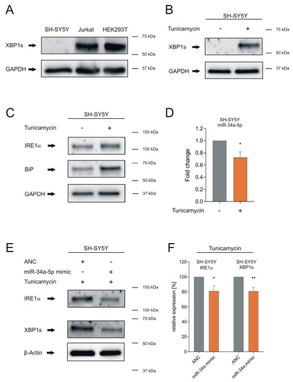 To determine the effects of miR-34a-5p on the protein level of the predicted targets, western blotting was performed. Therefore, HEK293T or SH-SY5Y were seeded with 2.5 × 105 cells per well in six-well plates. The following day, HEK293T cells were transfected either with pSG5 vector or pSG5-miR-34a expression plasmid by using PolyFect Transfection Reagent (Qiagen, Hilden, Germany) according to the manufacturer’s protocol. Following the manufacturer’s instructions, SH-SY5Y cells were transfected with hsa-miR-34a-5p miScript miRNA Mimic or AllStar Negative Control (ANC) by using HiPerFect Transfection Reagent (Qiagen, Hilden, Germany). At 48 h after transfection, cells were either directly harvested or treated with 5 µg/mL tunicamycin for an additional 4 h before harvesting. Proteins were isolated with 2× lysis buffer (130 mM Tris/HCl, 6% SDS, 10% 3-mercapto-1,2-propandiol, 10% glycerol) by sonification. A 15 µg quantity of whole-cell protein extract was separated by SDS-PAGE on Mini-Protean® TGX Stain-FreeTM Precast Gels (Bio-Rad Laboratories Inc., Hercules, CA, USA) and electroblotted on a nitrocellulose membrane (Whatman, GE Healthcare, Freiburg, Germany). To detect the proteins of interest, the antibodies anti-BiP monoclonal rabbit (3177S), anti-IRE1α monoclonal rabbit (3294S) and anti-XBP1s monoclonal rabbit (12782S) from Cell Signaling Technology (Danvers, MA, USA) were used. Anti-GAPDH monoclonal rabbit antibody (14C10, Cell Signaling Technology, Danvers, USA) or anti-β-Actin monoclonal mouse antibody (AC-15, Sigma Aldrich, Munich, Germany) was used as the endogenous control. The secondary antibodies used were obtained from Sigma Aldrich (Sigma Aldrich, Munich, Germany). Western blot analyses were performed in four independent experiments.