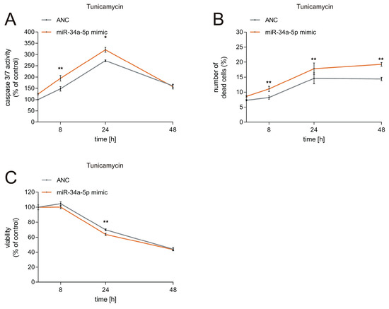 These results indicate that the most prominent effects of miR-34a-5p on cell viability and caspase activity occur 24 h after ER stress has been induced by tunicamycin. MiR-34a-5p overexpression affected the cytotoxicity most 48 h after induction of ER stress.