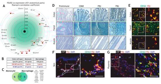 We have previously reported the existence of transcriptional overlaps between the variety of macrophage subsets that make up Tumor-Associated Macrophages (TAM) and M-CSF dependent macrophages, as both are enriched in the expression of the 170-gene “anti-inflammatory gene set” [19,29], which includes the FRβ-encoding FOLR2 gene [45]. Assessment of the genes significantly co-expressed with FOLR2 in 431 anatomical locations identified various genes of the “anti-inflammatory gene set”, including CD209, C1QC, CD163, LILRB5, F13A1, STAB1, RNASE1 and IGF1, with Pearson´s correlation coefficients ranging from 0.77 to 0.65 (Figure 1A). In line with these findings, analysis of monocytes or macrophages from human colon, whose transcriptomes have been extensively analyzed [55], also revealed an enrichment of the “anti-inflammatory gene set” (Figure 1B), also including the expression of CD209, C1QC, CD163, LILRB5, F13A1 and IGF1 from the “anti-inflammatory gene set” (Figure 1C). Given these results, FOLR2-encoded FRβ expression was evaluated in colon and other tissue macrophages under homeostatic conditions. In agreement with the transcriptional data, and using tissue arrays, an FRβ-specific antiserum [54] stained numerous cells in the lamina propria of the colon, where CD68+ macrophages were also detected (Figure 1D). Besides, FRβ+ cells were found in the paracortical area of the tonsil and, to a lesser extent, in skeletal muscle (Figure 1D). Further, multicolor immunofluorescence revealed that FRβ is co-expressed with the hemoglobin/haptoglobin scavenger receptor CD163 in lamina propria macrophages, as well as in tonsil and in skeletal muscle, thus indicating that FRβ marks tissue-resident macrophages (Figure 1E). In addition, FRβ was co-expressed with CD163 in the dermis (Figure 1F), where most FRβ+/CD163+ macrophages exhibited a perivascular distribution (Figure 1F), as well as in placenta [71] (Figure 1G). Therefore, FRβ is broadly expressed in vivo by tissue-resident macrophages, where its expression positively correlates with the macrophage marker CD163 and other genes of the “anti-inflammatory gene set”.