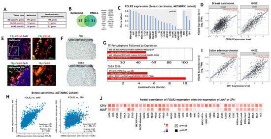 Expression of FOLR2 and FRβ in human tumor-associated macrophages. (A) Overlapping of M-MØ-specific and GM-MØ-specific genes within the lists of macrophage-specific genes in human melanoma [57] or head and neck squamous carcinoma (HNSC) samples [58]. (B) Identification of M-MØ-specific genes specific within the lists of macrophage-specific genes in human melanoma [57] and head and neck squamous carcinoma samples [58]. (C) Correlation of the expression of the FOLR2 gene and the expression of the 21-gene dataset shown in B. The correlation with the expression of MAF, MAFB and SPI1 is also shown. The shaded area indicates the significant positive correlations. (D) Correlation of the expression of the FOLR2 gene with the expression of CD163 in breast carcinoma and HNSC (TCGA Cohort). (E) Co-expression of FRβ and CD163 in human melanoma (upper panels) and a human melanoma xenograft (lower panels) using confocal microscopy after double immunofluorescence analysis of CD163 (red) and FRβ (green) expression. Yellow color indicates the FRβ/CD163 merged colocalizing areas. Right panels show a magnification of the FRβ/CD163 colocalizing area (marked in a box in left panels). (F) FRβ and CD68 expression in a sample of human colon adenocarcinoma. Light microscopy images of the macrophage marker CD68 and FRβ staining (magnification, ×20). (G) Enrichr analysis [67,68] of the genes indicated in panel B. (H) Correlation of the expression of the FOLR2 and SPI1 genes in colon adenocarcinoma and HNSC (TCGA Cohort). (I) Correlation of the expression of the FOLR2 gene with MAF and SPI1 expression in breast carcinoma (METABRIC Cohort). (J) Partial correlation of FOLR2 expression with the expression of MAF or SPI1 in the indicated tumors.