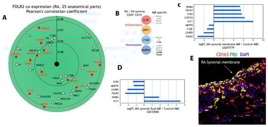 Expression of FOLR2 and FRβ in human synovium. (A) Identification of genes of the “anti-inflammatory gene set” whose expression most significantly correlates with FOLR2 expression in RA, using Genevestigator® [66]. Pearson´s correlation coefficients are indicated in each case. (B) Expression of genes of the “anti-inflammatory gene set” in each of the four monocyte subsets defined in inflamed synovial tissue by scRNA-seq [69]. (C,D) Comparison of the expression of representative M-MØ-specific (“anti-inflammatory gene set”) and GM-MØ-specific genes in control and inflamed synovial membrane (C) and synovial fluid (D). (E) Co-expression of FRβ and CD163 in human synovial membrane from an RA patient using confocal microscopy after double immunofluorescence analysis of CD163 (red) and FRβ (green) expression. Yellow color indicates the FRβ/CD163 merged colocalizing areas.