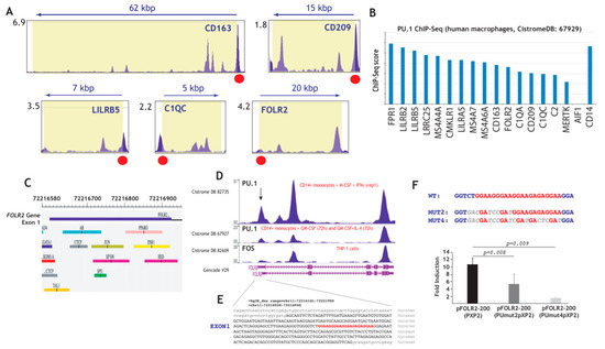 To obtain support for the potential involvement of PU.1 in FOLR2 gene expression, we revised the available ChIP-Seq information on the genes of the “anti-inflammatory gene set”, which had been found to be significantly expressed in tissue-resident macrophages (Figure 1) and TAM (Figure 2), and identified validated PU.1-binding sites immediately upstream of the first exon of most genes (Figure 4A and not shown) [76], including FOLR2 as well as PU.1-binding sites within most genes of the “anti-inflammatory gene set” (Figure 4B) [77]. The presence of 3–4 major peaks in ChIP-seq data for PU.1 binding within the FOLR2 gene [74,76,77], with one of them localized within exon 1, close to a potential FOS-binding site [78] (Figure 4C,D) and overlapping a sequence containing four evolutionary conserved potential Ets-binding sequences (5′-GGAAGGGAAGGAAGAGAGGAA-3′) [79,80] (Figure 4D,E), led us to address the control of FOLR2 expression by PU.1. To analyze the functional significance of this cluster of PU.1-binding elements, we initially evaluated its contribution to the transcriptional activity of the FOLR2 proximal promoter. In HeLa cells devoid of PU.1 [81,82], transfected with the pFOLR2-200Luc construct, which contains the fragment -214 to -34 and includes the PU.1-binding elements, overexpression of PU.1 resulted in 10-fold enhancement of the activity of the promoter (Figure 4F). Further, mutation of the two distal Ets elements (pFOLR2-200PUmut2pXP2, Figure 4F) reduced PU.1-dependent transactivation to 50% (p = 0.008), while mutation of the four Ets-sequences (pFOLR2-200PUmut4pXP2, Figure 4F) reduced PU.1 transactivation by 86% (p = 0.009), thus implying that PU.1 exerts a positive regulatory action on the FOLR2 proximal regulatory region through interaction with a cluster of Ets-cognate sequences within exon 1 of the FOLR2 gene.